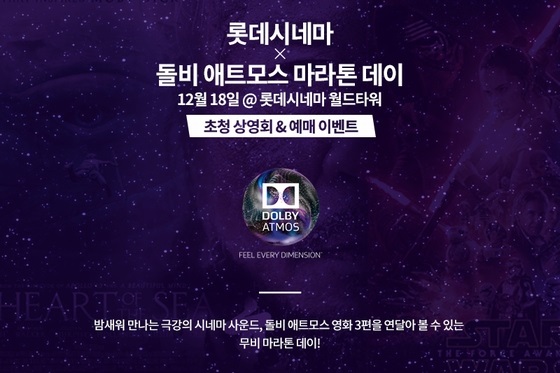 이번 ‘롯데시네마x돌비 애트모스 마라톤 데이’ 이벤트에서는 '스타워즈: 깨어난 포스', '대호', '하트 오브 더 씨' 등 올 하반기 최고 기대작들이 극강의 시네마 사운드인 돌비 애트모스로 믹싱돼 특별한 가격으로 연속 상영될 예정이다.