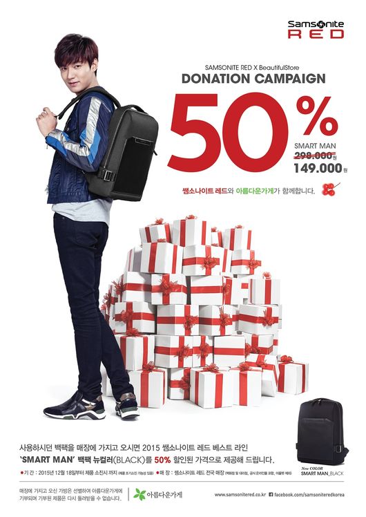 연말기부축제 취지의 이번 행사는 브랜드를 막론하고 자신이 메던 헌 백팩을 쌤소나이트 레드 전국 매장으로 가져오면 쌤소나이트 레드의 베스트셀러 백팩을 50% 할인가에 판매하는 방식으로 진행된다.