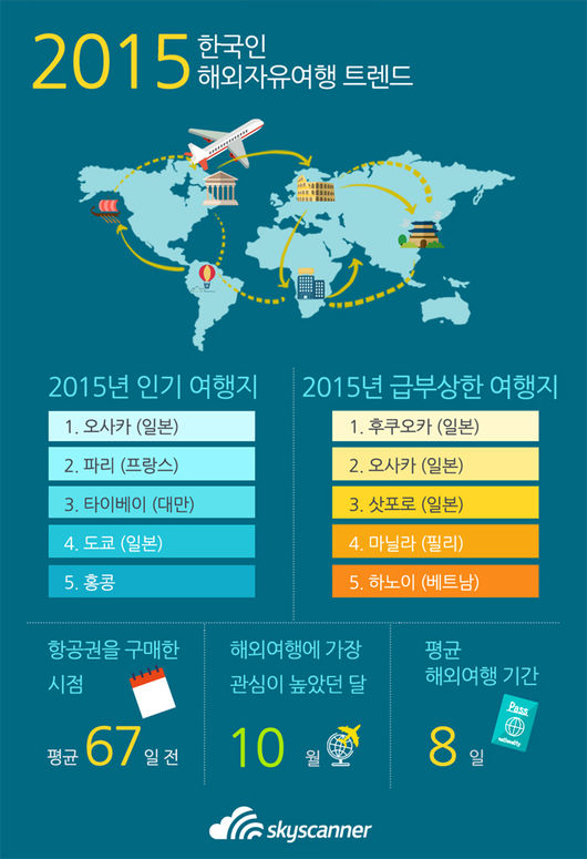 스카이스캐너가 발표한 '2015 한국인 해외자유여행 트렌드' 조사에 따르면, 2015년 1월부터 10월까지 우리나라 자유여행객들은 일본 오사카를 비롯 프랑스 파리, 대만 타이베이, 일본 도쿄, 홍콩 등에 관심을 갖고 검색한 것으로 나타났다.