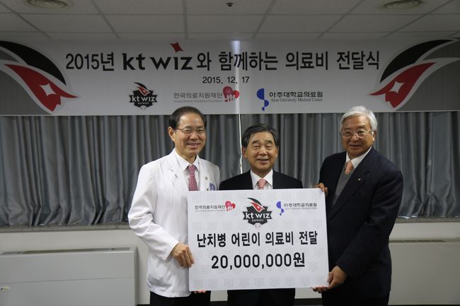 kt wiz 프로야구단(대표이사 김영수, ktwiz.co.kr)은 2015년 기부 프로그램 일환으로 수원 아주의료원에서 난치병 어린이를 위한 기부금 전달식을 진행했다고 17일 밝혔다.