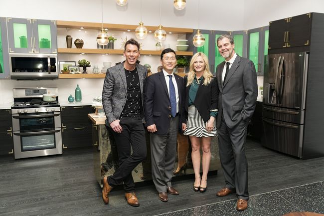 [사진] LG전자가 미국 뉴욕에서 프리미엄 주방 가전 패키지인 '블랙 스테인리스 스틸 시리즈'를 활용한 고객 체험 행사를 진행했다. 맨 왼쪽부터 미국 인테리어 전문채널인 HGTV의 유명 디자이너 데이비드 브롬스태드, 조주완 LG전자 미국법인장, 유명 디자이너 에밀리 헨더슨, LG전자 미국법인?데이비드 반더월 마케팅총괄 순. /LG전자 제공