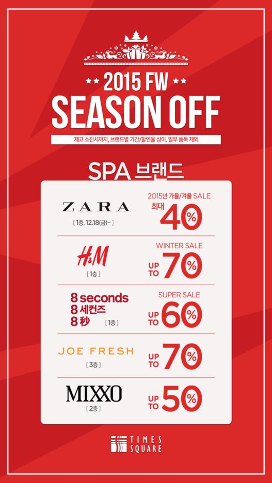 타임스퀘어는 방문자들을 위한 대규모 브랜드 할인 프로모션인 '2015 F/W 시즌오프'를 최장 내년 2월 29일까지 펼친다. 이번 시즌오프 프로모션은 'H&M', '자라', '모던하우스' 등 인기 패션 브랜드부터 리빙 편집숍까지 각양각색 브랜드들과 함께 협업하여 고객들이 최대 70% 할인된 가격으로 쇼핑할 수 있도록 구성한 것이 특징이다.