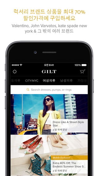 '길트(Gilt)'는 명품 브랜드를 할인가로 구매할 수 있는 쇼핑 앱이다. 럭셔리, 디자이너 브랜드를 소매가의 최대 70% 할인가로 구매할 수 있다. 실시간 알림 시스템으로 세일의 시작 시기나 구매 가능 시기를 확인할 수 있다.