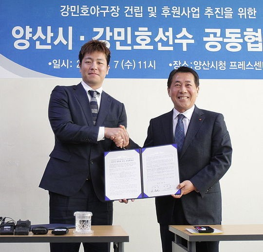 양산시는 황산문화체육공원에 1만5000㎡ 부지를 마련, 총 예산 5억원을 들여 '강민호 야구장' 건설에 곧바로 착수했다. 5억원 가운데 강민호가 2억원, 양산시가 3억원을 냈다. '강민호 야구장'은 관람석 200석과 운영실, 선수대기실, 화장실, 주차장 등이 포함되어 있다. '강민호 야구장'은 최근 공사를 마치고 공식 개장경기만을 기다리고 있다.