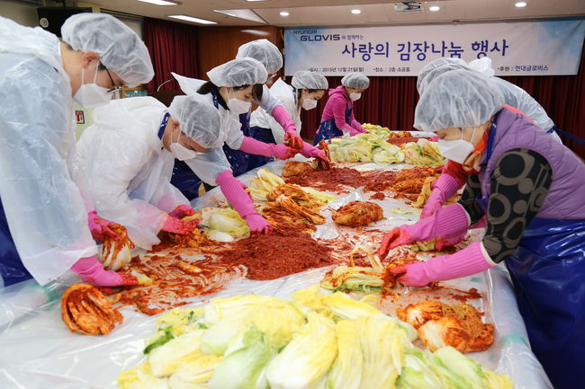 글로벌 종합물류유통기업 현대글로비스는 21일, 서울 강남구 강남종합사회복지관에서 ‘2015년 사랑의 김장나눔’ 행사를 열었다. 현대글로비스 임직원 20여 명이 직접 김장김치를 담근 뒤 지역사회 내 복지사각 지대에 있는 어르신 가정에 전달했다.