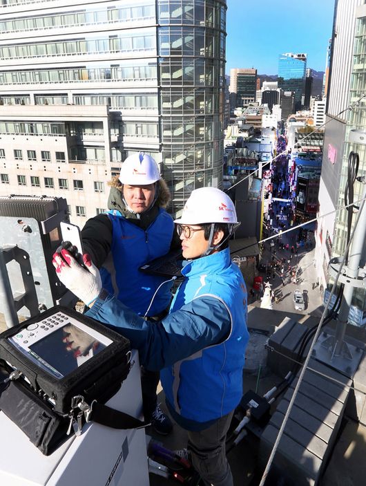 [사진]SK텔레콤 구성원들이 명동거리 앞 기지국에서 네트워크 장비를 점검하고 있다. /SK텔레콤 제공