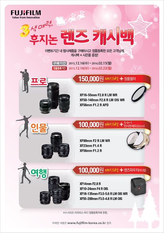 후지필름 일렉트로닉 이미징 코리아는 연말을 맞아 시크릿프레젠트와 캐시백 이벤트를 실시하고 있다. 각각 1월 중순과 2월 중순까지로 디지털 카메라 X시리즈와 후지논 XF렌즈 구매자 전원을 대상으로 진행된다. 미러리스 3종 X-T1, X-T10, X-A2, 콤팩트 3종 X100T, X30, XQ2 구매 후 공식 홈페이지를 통해 정품 등록을 하면 뚜레쥬르 케이크 기프티콘 증정 및 경품 추첨을 통한 신세계 100만원 상품권, 아웃도어 카메라 후지필름 XP80 등 푸짐한 선물이 준비되어 있다. 또한 프로용, 인물용, 여행용으로 나뉜 총 10종의 후지논 XF렌즈 구매자에게 상품권 캐시백과 각 촬영 환경에 맞는 정품필터, 반사판, 여행용 파우치 등 최대 25만 원 상당의 혜택이 주어진다.