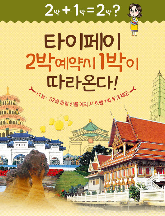 이번 프로모션은 대만에서 가장 큰 국적 항공사인 중화항공 에어텔 상품 '다이너스티 에어텔' 예약자에게 해당되며, 2박3일 가격으로 3박4일 여행을 즐길 수 있어 혜택이 크다.