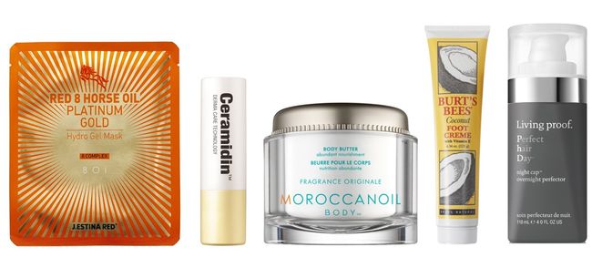 [사진] 왼쪽부터 제이에스티나 레드 뷰티 '레드8 홀스오일 플래티늄 골드 하이드로 겔 마스크', 닥터자르트 '세라마이딘 립페어 퓨어', 모로칸오일 '바디 버터 프래그런스 오리지날', 버츠비 '코코넛 풋 크림', 리빙프루프 '퍼펙트 헤어 데이 나이트 캡 오버나이트 퍼펙터'