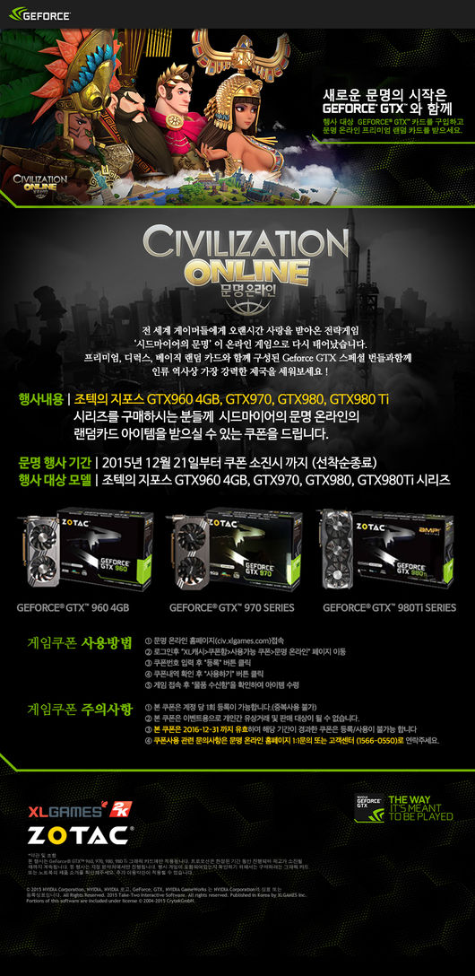 이에 조텍코리아에서는 ‘조텍 지포스 GTX 960 OC 듀얼사일런서 백플레이트 D5 4GB’ 이상 모델을 구입하는 구매자를 대상으로, 프리미엄, 디럭스, 베이직 랜덤 카드을 증정하는 지포스 GTX 스페셜 번들 프로모션을 진행한다. 본 쿠폰은 계정 당 1회 등록이 가능하며, 2016년 12월 31일까지 유효하다. 랜덤 카드 쿠폰은 제품 내에 동봉되어 있으며, 문명 온라인 홈페이지에서 등록 후 사용 할 수 있다. 한정 수량으로 진행되기 때문에 수량 소진 시 자동 종료 된다.
