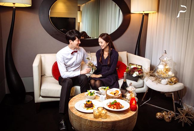 먼저 고급스러운 스위트룸에서 프라이빗하게 즐기는 다이닝 패키지가 제공된다. 안락한 분위기의 프리미어 스위트 1박과 함께 호텔 셰프가 준비하는 인룸 다이닝이 포함되며, 다이닝에는 샐러드, 해산물 파스타, 스테이크 등 2인 디너 코스와 세계적으로 큰 사랑을 받는 디아블로 데빌스 브뤼(Diablo Devil's Brut / 750ml) 와인 1병이 제공되어 객실에서 오붓한 연말 분위기를 즐길 수 있다. 특히, 디아블로 데빌스 브뤼는 달콤한 시트러스와 그린 애플의 아로마를 함께 느낄 수 있어 로맨틱한 분위기를 만들어 준다. 가격은 43만 원(12월 26일, 31일)이며, 크리스마스 이브와 당일 이용은 45만 원(세금 및 봉사료 별도 / 12월 24일, 25일)이다.
