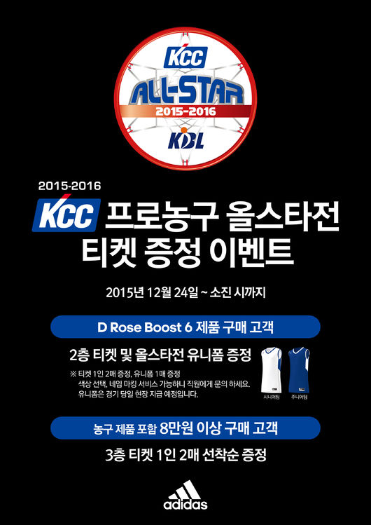아디다스(www.adidas.com)는 오는 1월 10일(일)에 개최되는 2015-2016 KCC 프로농구 올스타전을 기념하여 아디다스 농구 용품을 구매한 고객들을 대상으로 다양한 상품 및 당일 대회 티켓을 제공하는 프로모션을 진행한다.