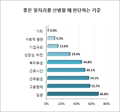 온라인 취업포털 사람인이 성인남녀 1986명을 대상으로 “귀하가 좋은 일자리를 선별할 때 판단하는 기준은 무엇입니까?”라고 설문한 결과, 조건 1위는 ‘임금’(66.8%, 복수응답)이었다.