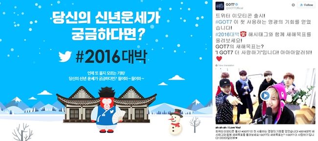 [사진] 오른쪽은 갓세븐 #2016대박 해시태그 이모티콘 런칭 트윗. /트위터코리아 제공.
