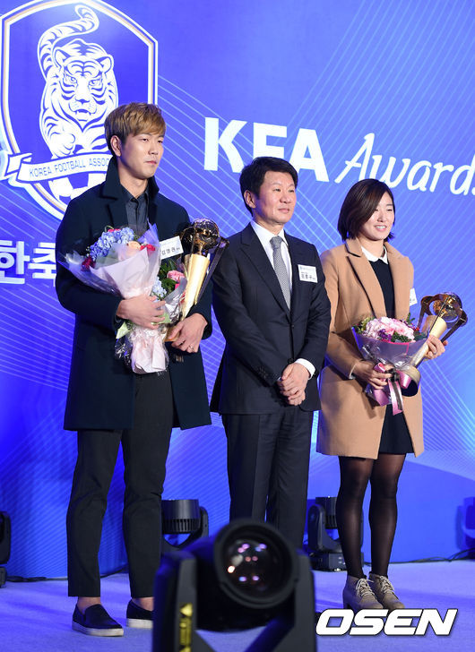 대표팀 중앙수비수 김영권과 여자대표팀 주장 조소현이 23일 오전 11시 서울 백범김구기념관에서 열린 '2015 KFA 시상식'에서 처음으로 '올해의 선수'가 되는 기쁨을 누렸다.