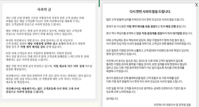 이 글이 23일 일파만파 퍼지고, 국내 양대 대형 포털 실시간 검색어에 오르자 치킨매니아 측은 본사 차원에서 공식 홈페이지에 사과글을 올렸지만 비난의 화살은 여전히 치킨매니아와 해당 점주에게 날카롭게 향해 있다. /osenlife@osen.co.kr