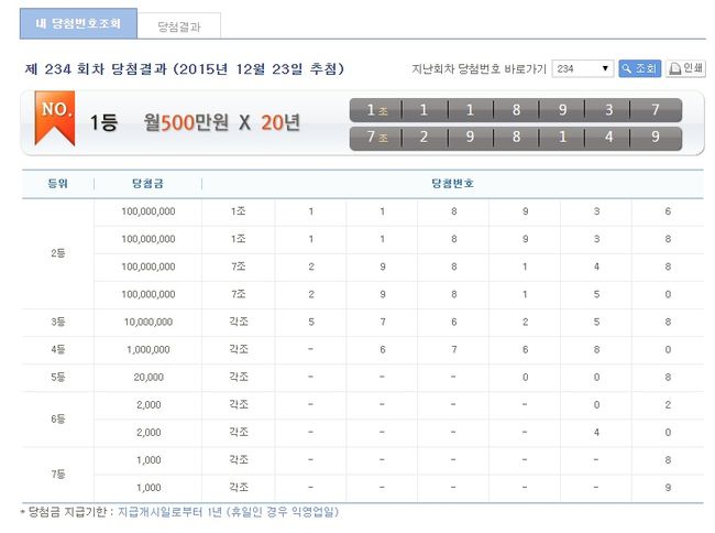 [사진] 나눔로또 홈페이지 제 234회차 연금복권 당첨 결과 캡처.