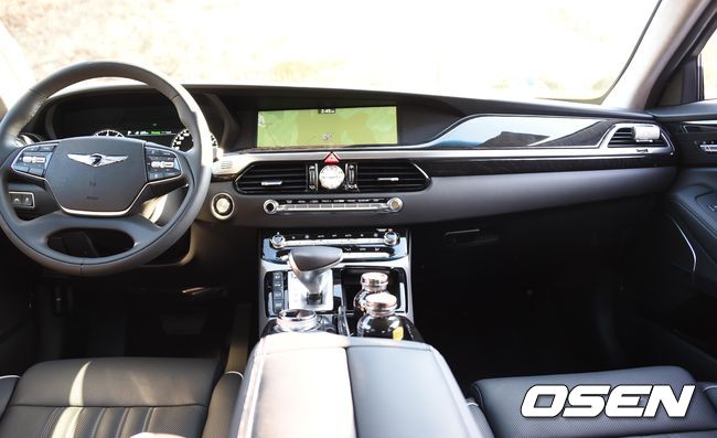 그러나 실내로 들어가면 성격은 완전히 달라진다. 가공처리를 최소화 한 프라임 나파가죽 시트, 원목 고유의 색감과 나뭇결을 살린 리얼우드, 스테인레스로 된 도어 스피커 메탈 그릴 등이 ‘프리미엄’의 가치를 느끼게 해 준다. 대시보드에 크게 자리잡은 가로선과 센터페시아에서 시작해 뒷좌석까지 이어지는 세로선은 자칫 휑할 수 있는 실내공간을 짜임새 있게 나눠준다.