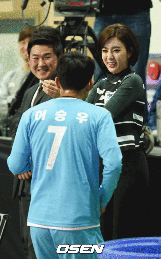 27일 오후 서울 중구 장충체육관에서 열린 '2015 셰어 더 드림 풋볼 매치(SHARE THE DREAM FOOTBALL MATCH 2015)' 사랑팀과 희망팀의 경기, 후반 희망팀 이승우가 골을 넣은 뒤 정지원 아나운서와 춤을 추고 있다.