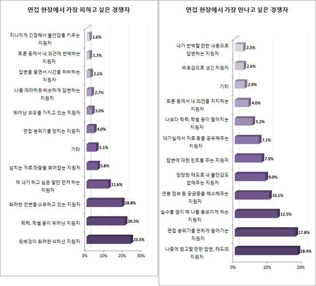 반면, 면접 현장에서 가장 만나고 싶은 경쟁자를 묻자 ‘나중에 참고할 만한 답변, 태도의 지원자’(18.4%)를 첫 번째로 꼽았다. 뒤이어 ‘면접 분위기를 편하게 끌어가는 지원자’(17.8%), ‘실수를 많이 해 나를 돋보이게 하는 지원자’(12.5%), ‘연봉 정보 등 궁금증을 해소해주는 지원자’(10.1%), ‘당당한 태도로 내 불안감도 없애주는 지원자’(9%), ‘답변에 대한 힌트를 주는 지원자’(7.9%), ‘대기실에서 자료 등을 공유해주는 지원자’(7.1%) 등의 순이었다.