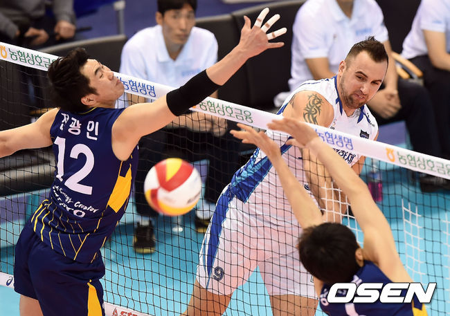 1세트 중반까지 팽팽한 접전이 이어졌다. 하지만 16-16에서 삼성화재가 균형을 깼다. 이선규의 속공, 류윤식과 그로저의 블로킹으로 달아났다. 이선규까지 블로킹에 가세하며 한국전력의 공격을 무력화시킨 삼성화재는 그로저의 블로킹으로 세트 포인트를 장식, 25-20으로 1세트를 따냈다. 그로저가 블로킹 4개 포함 9점을 올렸다.