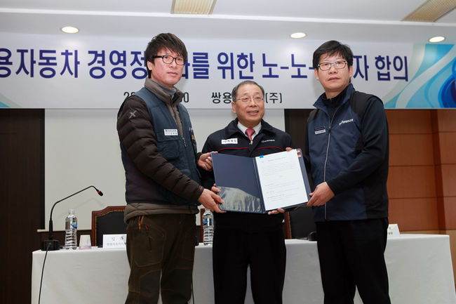 또한 이사회 의결 이후 평택공장 본관 대회의실에서 노∙노∙사 3자 대표자인 최종식 쌍용차 대표이사, 홍봉석 노동조합 위원장, 금속노조 쌍용자동차지부 김득중 지부장들과 그간 실무협의를 진행해 왔던 3자 관계자 등이 참여한 가운데 합의서에 대한 조인식도 함께 진행됐다.