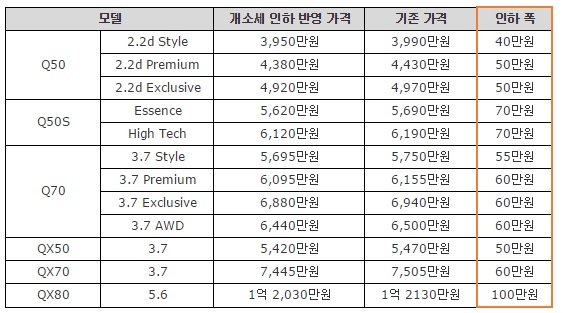 인피니티 코리아는 12월 31일부로 종료되는 정부의 개별소비세 인하 정책을 브랜드 자체적으로 내년 1월까지 연장 적용한다고 밝혔다.