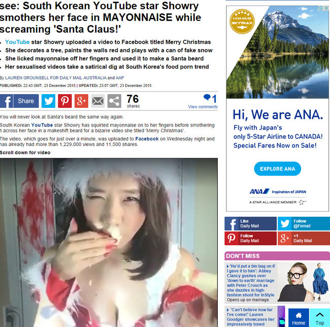 지난 24일(이하 한국시간) 영국 매체 '데일리메일'은 쇼리에 대해 소개했다. 쇼리는 국내 아프리카TV에서 활동하는 BJ로, '데일리메일'은 "한국의 유튜브 스타 쇼리가 얼굴에 마요네즈를 듬뿍 바르고 '산타 클로스'를 외쳤다고 보도했다.