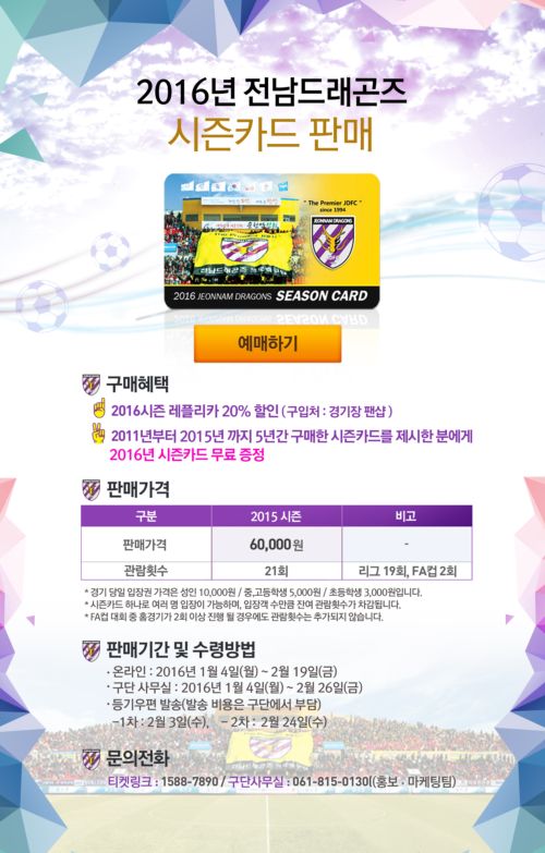 전남 드래곤즈는 내년 1월 4일부터 구단 홈페이지(www.dragons.co.kr) 및 티켓링크(http://sports.ticketlink.co.kr/football/event/39)를 통해 2016년 전남드래곤즈의 모든 홈경기를 관람할 수 있는 시즌카드를 판매한다.