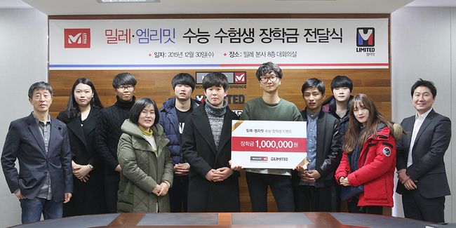 프랑스 정통 아웃도어 브랜드 밀레(㈜MEH, 대표 한철호)가 '빛나라 수험생’ 이벤트를 통해 선발한 2016 대입수학능력시험 수험생 고객들에게 장학금을 전달하는 장학금 수여식을 개최했다고 31일 밝혔다.