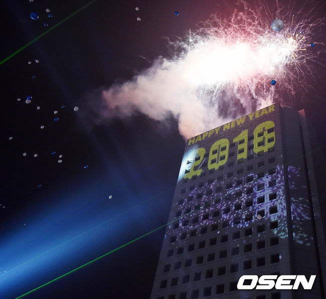31일 오후 서울 강남구 코엑스 앞 영동대로 일대에서 진행된 '더 브릴리언트 카운트 다운 2016' 새해맞이 이벤트에서 새해를 맞아 폭죽이 터지고 있다.