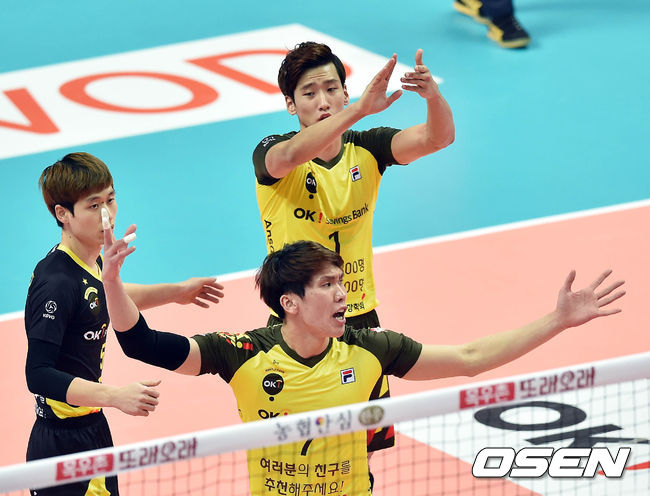1일 오후 안산 상록수체육관에서 '2015-2016 V-리그' 남자부 OK저축은행과 삼성화재의 경기 1세트 OK저축은행 김규민과 송명근이 심판에게 항의하고 있다.