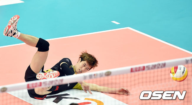 1일 오후 안산 상록수체육관에서 '2015-2016 V-리그' 남자부 OK저축은행과 삼성화재의 경기 1세트 OK저축은행 조국기가 서브를 받아내지 못하고 있다.