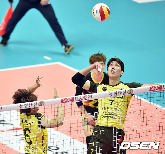 1일 오후 안산 상록수체육관에서 '2015-2016 V-리그' 남자부 OK저축은행과 삼성화재의 경기 1세트 OK저축은행 이민규의 리시브를 김규민이 받아 공격하기 위해 공을 바라보고 있다.