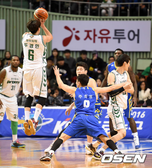 2쿼터 동부 두경민이 김주성의 스크린으로 삼성 주희정의 수비를 따돌리고 3점슛을 시도하고 있다.