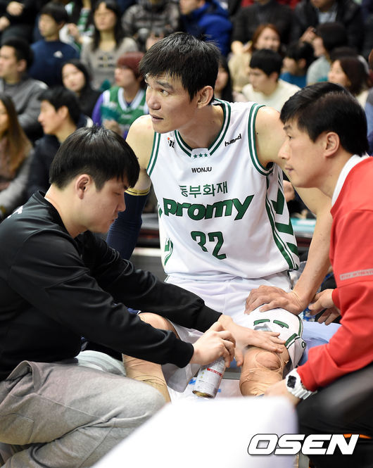 4쿼터 부상으로 교체된 동부 김주성이 치료를 받으며 경기를 지켜보고 있다./jpnews@osen.co.kr