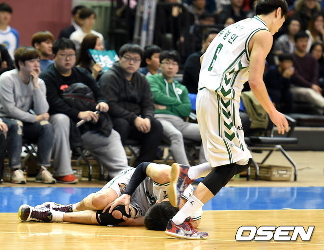 4쿼터 동부 김주성이 두경민과 공격하는 과정에서 충돌, 무릎을 부여잡고 괴로워하고 있다./jpnews@osen.co.kr