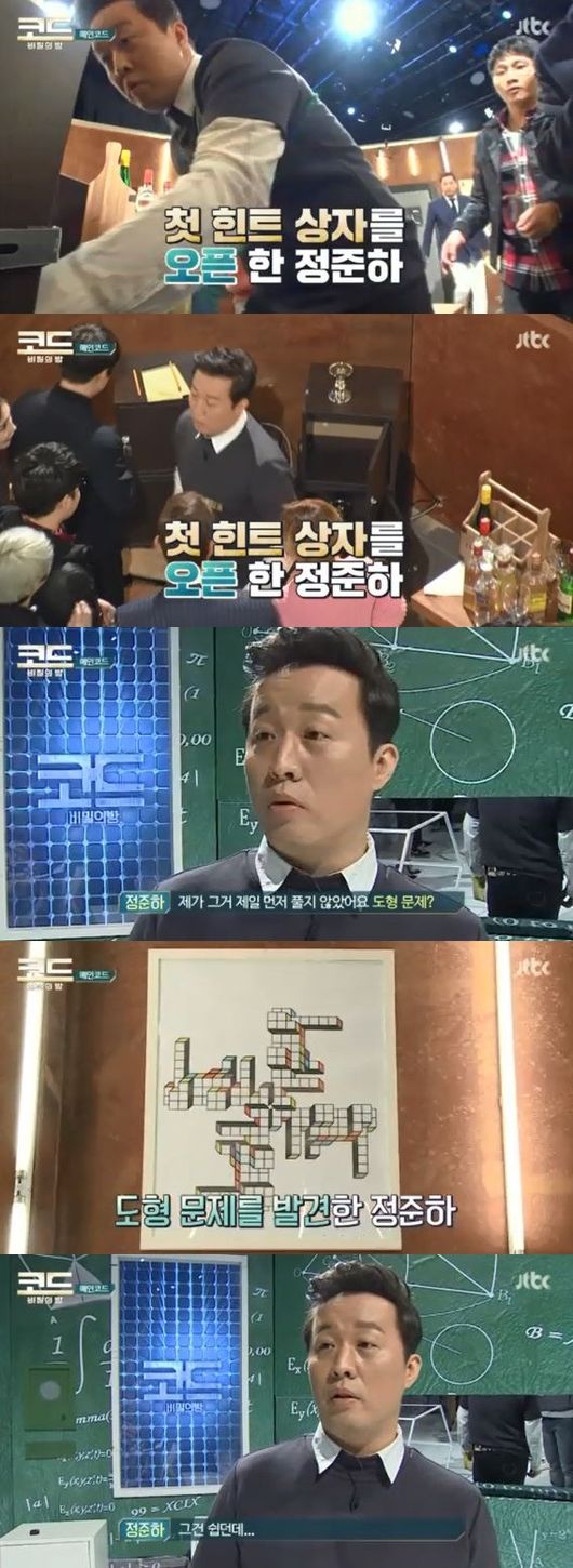 하지만 정준하가 갑자기 코드를 찾았다고 말했다. 다들 뭘로 열었냐고 하자 "그건 이해못하지"라고 했고 정준하는 "내가 제일 먼저 도형 문제 풀지 않았냐"고 했다.