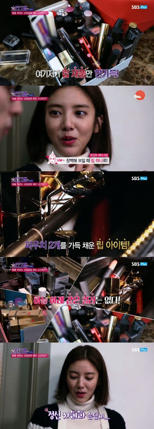 이날 공개된 손담비의 파우더 룸에는 다양한 립 제품이 눈길을 끌었다. 손담비는 “평상시에는 화장을 거의 안 하는 편이어서 창백해 보일 때 립 하나로 (포인트를 준다)”라고 밝히며 립 제품을 좋아하는 이유를 밝혔다.
