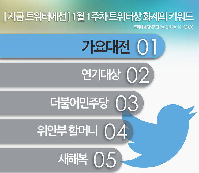 트위터는 다음소프트와 함께 지난 한 주간(2015년 12월 28일~2016년 1월 3일) 트위터 상에서 가장 이슈되는 핫 키워드들 중 주목할 만한 검색어를 선정, 발표했다.