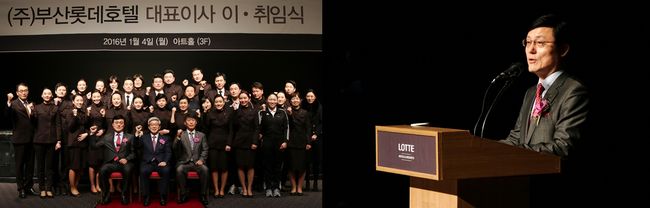 ㈜부산롯데호텔은 지난 4일 오후 4시 호텔 3층 아트홀에서 대표이사 이·취임식 및 시무식을 열었다. 300여명의 임직원이 참석한 가운데 직원 간 새해 인사로 행사를 연 부산롯데호텔은 이어서 2016년 시무 및 송용덕 전임 대표이사 이임을 기념하는 영상물을 시청하고, 전·신임 대표이사로부터 이임사 및 취임사를 청해 들었다.