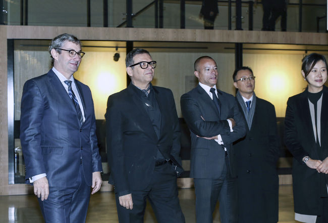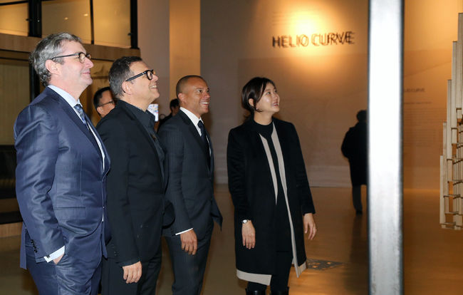[사진] 루크 동커볼케 현대디자인센터장, 피터 슈라이어 현대·기아차 디자인 총괄 사장, 맨프레드 피츠제럴드 제네시스 전략담당 전무(왼쪽부터)가 현대자동차 관계자들과 함께 작품을 관람하고 있다. /현대자동차 제공.