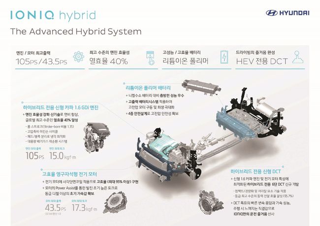 현대차에 따르면 아이오닉 하이브리드 모델에 하이브리드 차량 전용으로 개발한 최대출력 105ps, 최대 토크 15.0kgf·m의 신형 카파 1.6GDi 엔진과 최대 출력43.5ps(32kW 환산 시), 최대 토크 17.3kgf·m의 고효율 영구자석형 모터 시스템을 적용해 강력한 동력성능과 함께 연료 효율성을 극대화한 것이 특징이다.