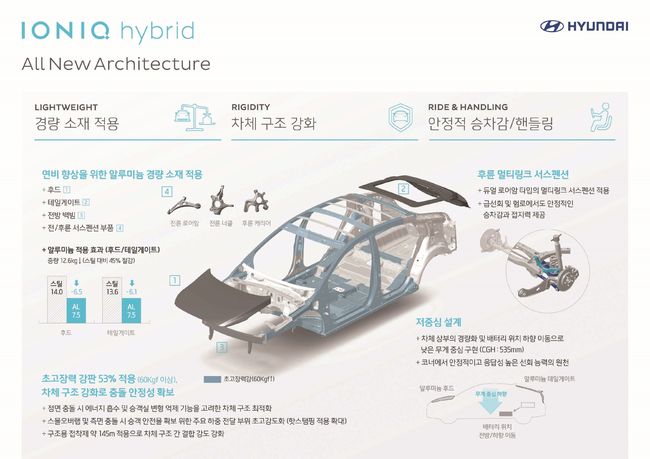 현대차는 아이오닉 하이브리드 모델에 신소재, 신기술이 적용된 새로운 신규 플랫폼을 적용해 차체 강성을 높이고 차량 경량화를 실현했다. 후드, 테일게이트, 백빔 및 샤시부품 등에 알루미늄 소재를 사용하고 연료 탱크는 강화 플라스틱 소재로 제작해 차체 중량을 낮췄다.