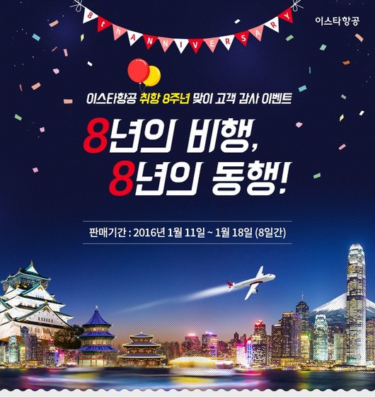 지난 2009년 1월 7일 김포~제주 노선 첫 취항 후 2016년 1월 7일 취항 8주년을 맞은 이스타항공은 국내선, 국제선, 중국노선별 특가 항공권을 제공한다고 밝혔다.