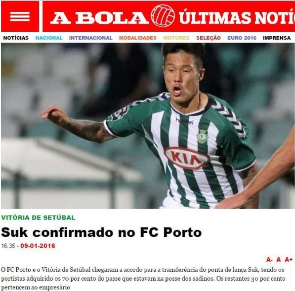 포르투갈 언론 '아 볼라' 9일(한국시간) "석현준이 FC 포르투로 이적한다. 포르투와 비토리아가 이적에 합의했다"고 전했다. 보도에 따르면 석현준의 이적료는 당초 알려진대로 150만 유로(약 20억 원)인 것으로 알려졌다.