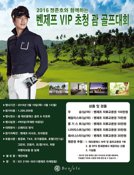 스타일리시 골프웨어 벤제프(www.benjefe.com)가 신년을 맞아 ‘정준호와 함께하는 2016 VIP 초청 괌 골프 대회’를 실시한다.