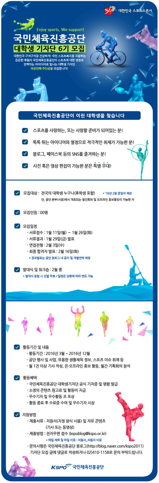 지원방법은 국민체육진흥공단 공식 블로그(http://blog.naver.com/kspo2011) 모집 페이지에 있는 지원서 및 콘텐츠를 작성해 이메일(kspoblog@kspo.or.kr)로 제출하면 된다.