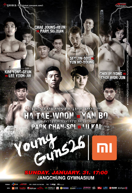 31일 일요일, 장충 체육관에서 XIAOMI ROAD FC 028과 함께 개최될 ROAD FC YOUNG GUNS 26의 모든 대진이 결정됐다. 이번 대회에는 총 12명의 YOUNG GUNS 파이터들이 출전한다.