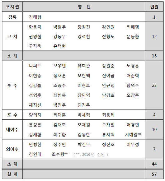 전지훈련 참가 선수단은 김태형 감독을 포함한 코칭스태프 13명과 선수 44명 등 총 57명이다. 선수단은 16일부터 3월 3일까지 48일간 호주 시드니와 일본 미야자키에서 2016시즌 준비를 위한 본격적인 담금질에 들어간다.